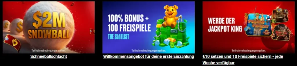 Im Bereich Aktionen und Boni im pokerstars Casino finden Spieler regelmäßig attraktive Boni und Aktionen, von einem großzügigen Willkommensbonus bis zu wöchentlichen Freispielen und Reload-Bonusangeboten. Der Bonus wird klar erläutert, inklusive Umsatzbedingungen, Mindestumsatz und Fristen. Spieler sollten die Aktionsseite prüfen, um aktuelle Boni, Treueprogramm‑Vorteile und saisonale Promotionen nicht zu verpassen. pokerstars bietet zudem spezielle Freispiele, Cashback-Aktionen und zeitlich begrenzte Aktionen, die das Spielen abwechslungsreicher und lohnender machen. Leser sollten außerdem die Bedingungen für Auszahlung und Registrierung kennen, damit es später keine Überraschungen gibt.